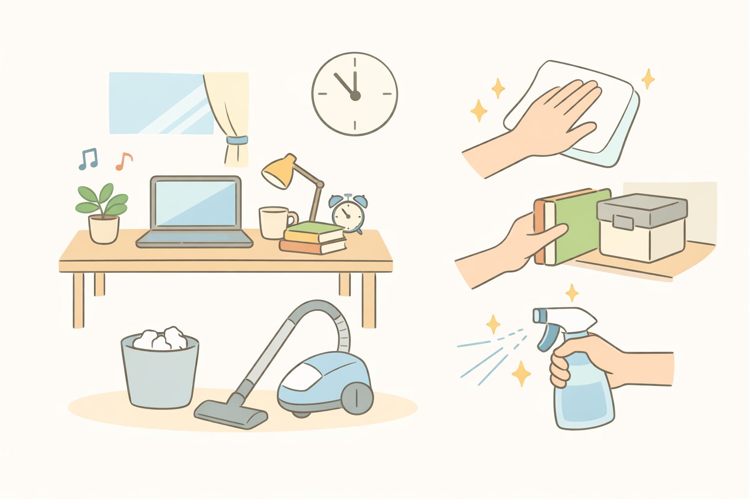 散らかった状態をゼロに戻すというよりも、目につく場所を整えて、気持ちの切り替えをしやすくするための習慣と考えると分かりやすいでしょう。